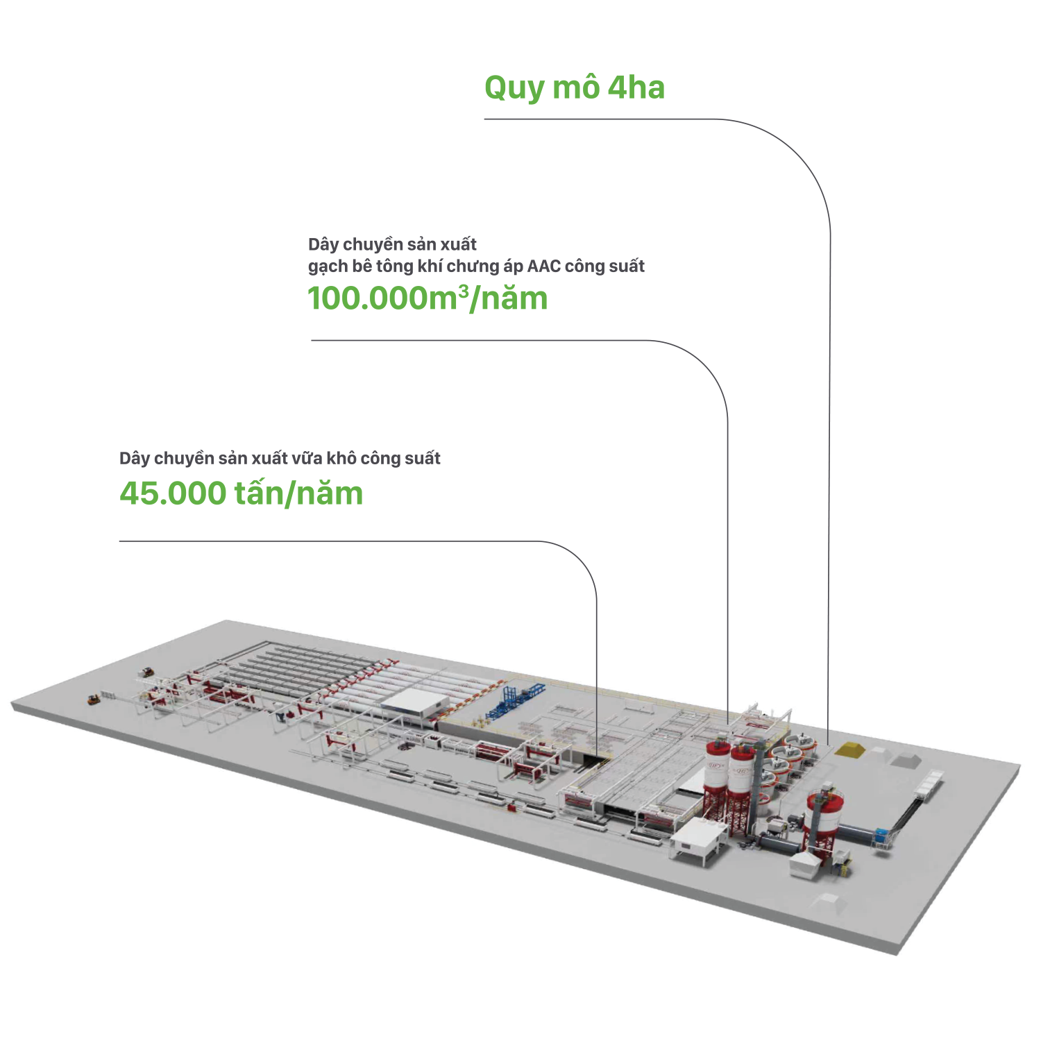 Giai đoạn 1: Bao gồm dây chuyền sản xuất gạch bê tông khí chưng áp AAC công suất 100.000m³/năm; dây chuyền sản xuất vữa khô công suất 45.000 tấn/năm.